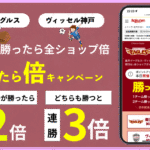 楽天イーグルスやヴィッセル神戸が勝利した際に開催される「勝ったら倍キャンペーン」では、楽天イーグルス・ヴィッセル神戸が勝った翌日はエントリーで全ショップポイント2倍・ダブル勝利で3倍のポイントが獲得できるチャンスがあります。このキャンペーン利用時のポイントは以下の通りです。