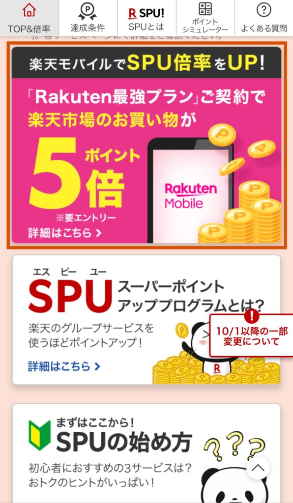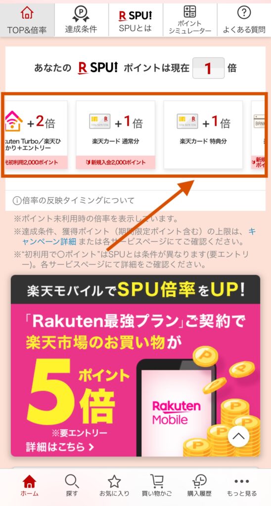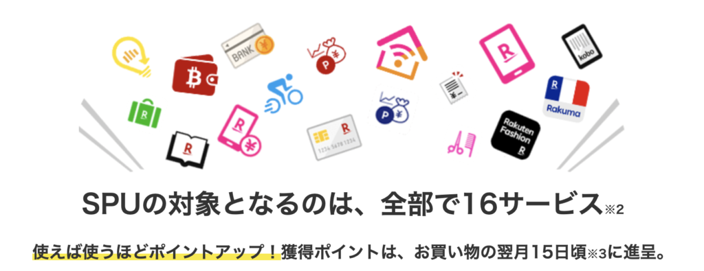 SPUでは、楽天の各サービスを使うことで、期間中のお買い物のポイント倍率がアップします。