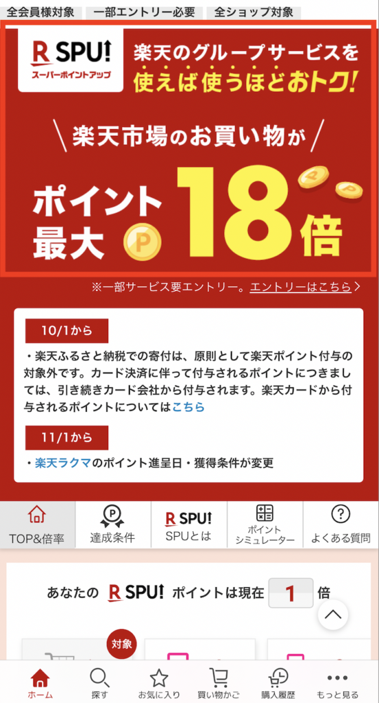 SPU(スーパーポイントアッププログラム)とは、楽天の各種サービスを利用し、条件を達成することで、楽天市場でのお買い物でもらえるポイント倍率が最大18倍まで上昇する制度です。