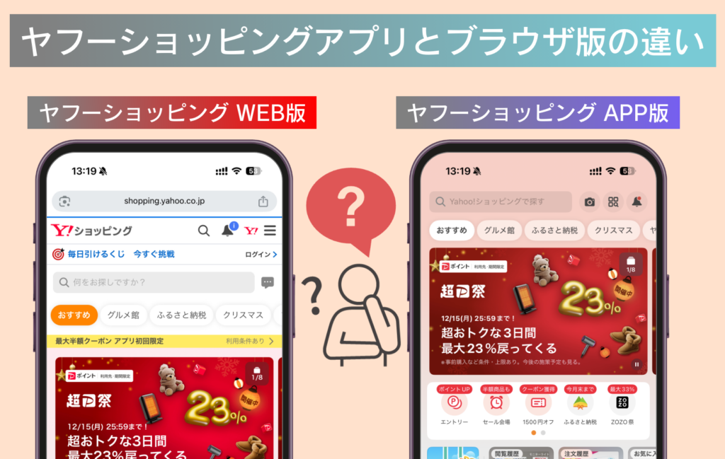 ヤフーショッピングのアプリ版とブラウザ版の違いを説明致します!それぞれにメリットがあるので、普段の使い方で選ぶのがおすすめです。ここでは、アプリとブラウザの主な機能の違いをわかりやすく紹介していきます。
