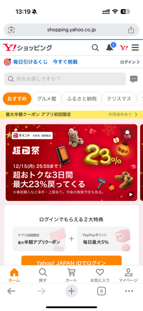 - ログインせずに利用できる一方、アプリに比べて一部のキャンペーンやクーポンが少ない