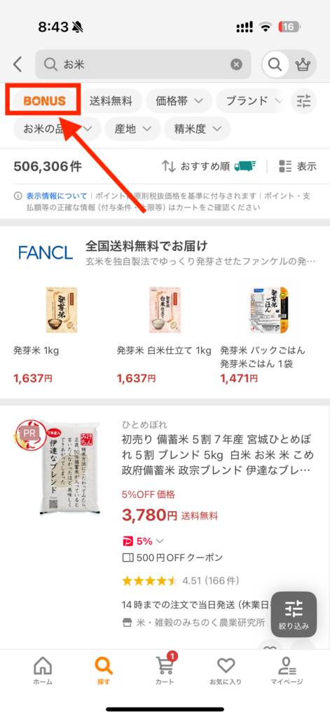 ボーナスストアPlusは、商品検索ページから手軽に絞り込む事ができます。Yahoo!ショッピングの検索窓から商品を検索し、検索結果画面にある「BONUS」ボタンをタップするだけで、ボーナスストアPlusのみを表示することができます。
