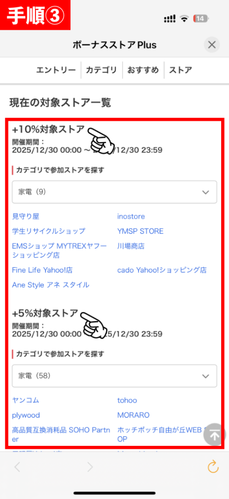 さらにボーナスストアPlusのキャンペーンにエントリーした後に、対象ストア内の優良ストアから購入すると+3%のPayPayポイント増量キャンペーンを受け取ることができます。具体的には以下の通りです。