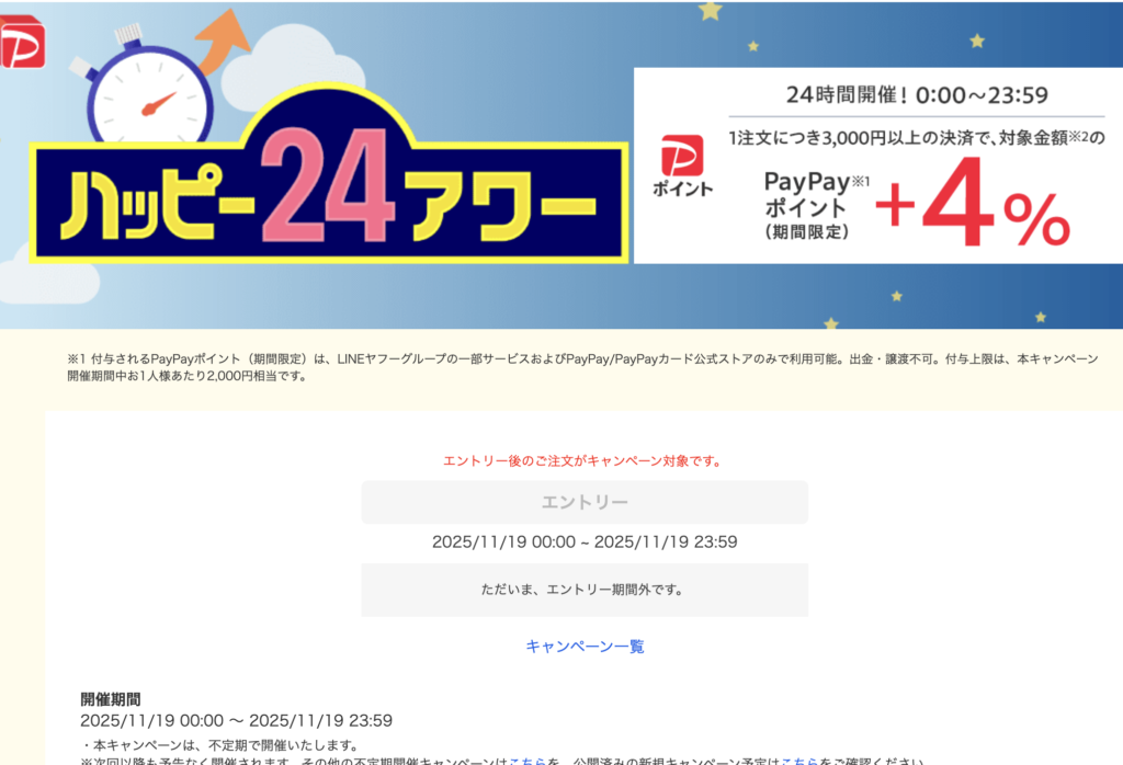 ヤフーショッピングの全ストアを対象に毎月2回程度開催されるポイントアップキャンペーンハッピー24アワーは、事前予告なしの完全非公表キャンペーンである為、いつ開催されるのかまったく読めないのが難点です。