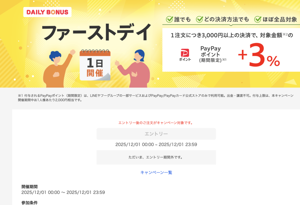 毎月1日に特設ページでエントリーしたうえで、1注文あたり税込3,000円以上決済すると+3%のPayPayポイントが付与されます。ボーナスストアの指定がないのでおすすめです!!